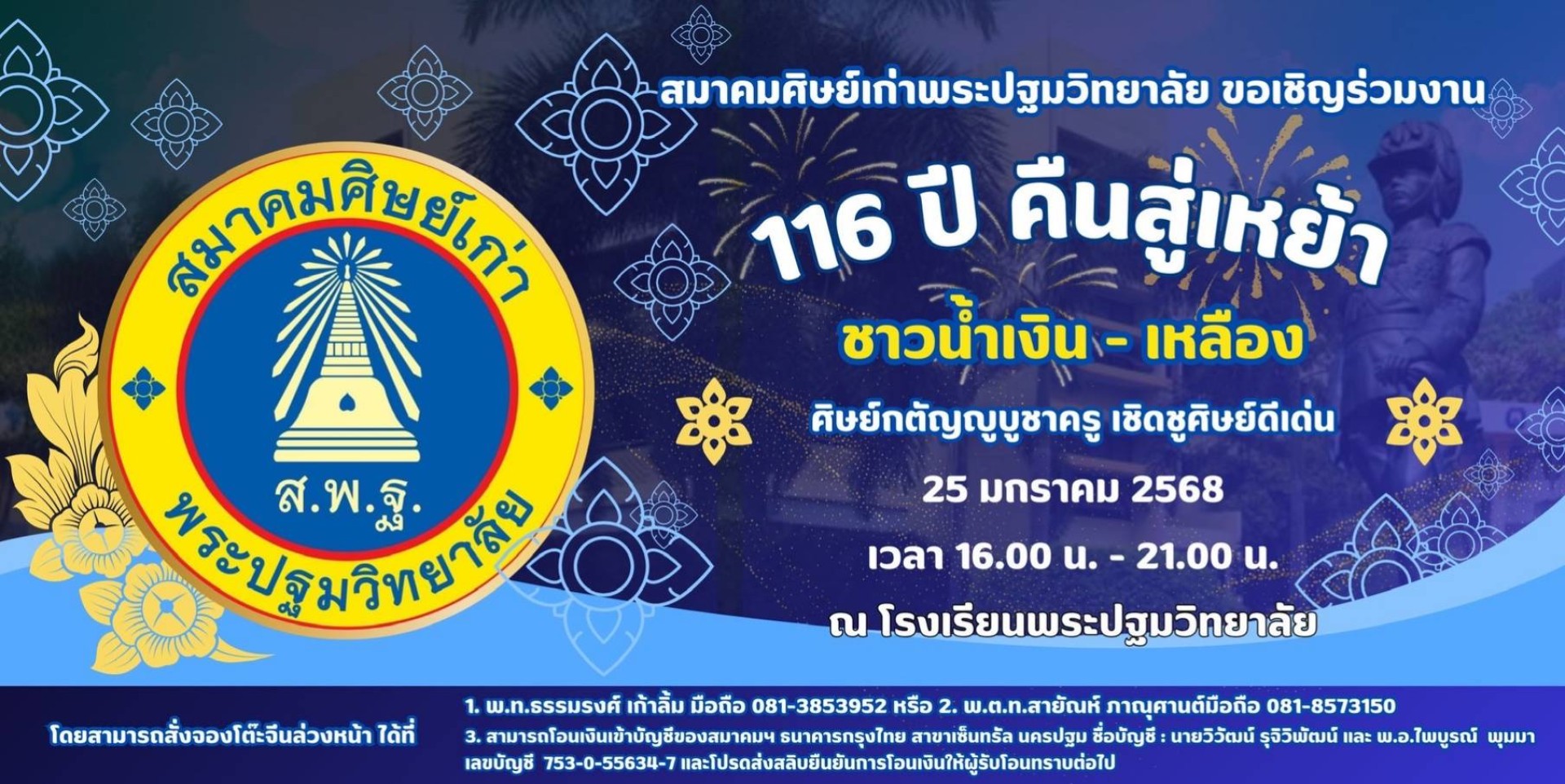 “งาน 116 ปี คืนสู่เหย้าชาวน้ำเงิน-เหลือง ประจำปี 2568” สมาคมศิษย์เก่าพระปฐมวิทยาลัย